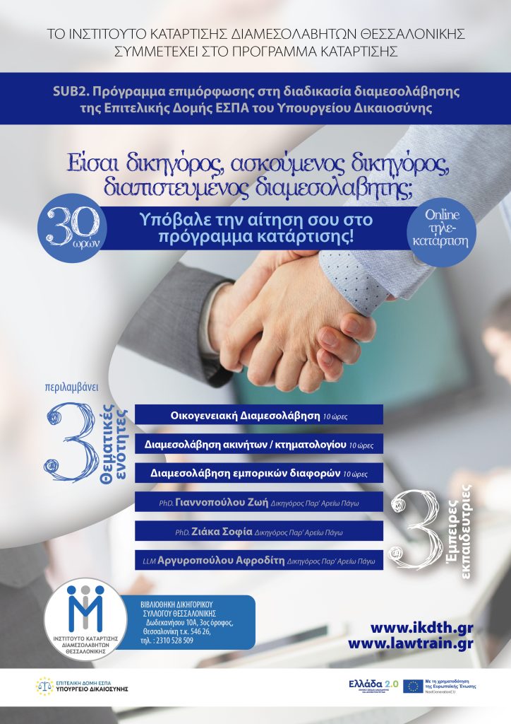 Το Ινστιτούτο Κατάρτισης Διαμεσολαβητών Θεσσαλονίκης (ΙΚΔΘ), πιστοποιημένο κέντρο εκπαίδευσης διαμεσολαβητών του Υπουργείου Δικαιοσύνης, συμμετέχει στο συγχρηματοδοτούμενο πρόγραμμα κατάρτισης «Πρόγραμμα Επιμόρφωσης στη Διαδικασία της Διαμεσολάβησης», στο πλαίσιο της δράσης «Επιτάχυνση της απονομής της Δικαιοσύνης», από το Υπουργείο Δικαιοσύνης με τη χρηματοδότηση του Ταμείο Ανάκαμψης και Ανθεκτικότητας.