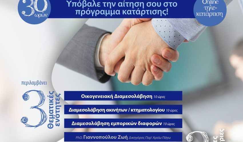 *εξαιρούνται οι διαμεσολαβητές που έχουν ολοκληρώσει μετεκπαίδευση σε μία τουλάχιστον από τις δύο υποχρεωτικές θεματικές (Οικογενειακή Διαμεσολάβηση ή /και Διαμεσολάβηση σε Κτηματολογικές διαφορές)